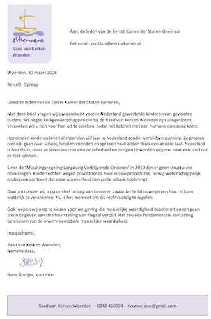 In deze brief aan de Eerste Kamer vraagt de Raad van Kerken Woerden om een humane oplossing voor in Nederland gewortelde kinderen van gevluchte ouders.