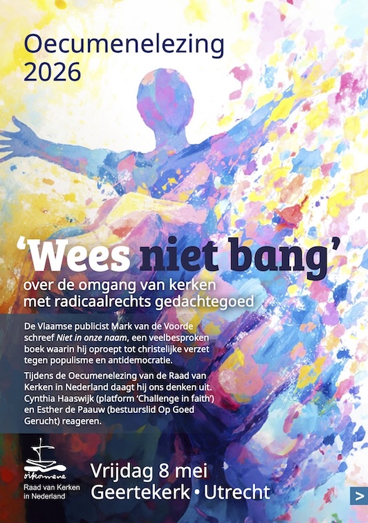 De Raad van Kerken in Nederland organiseert op 8 mei a.s. in de Geertekerk in Utrecht de Oecumenelezing 2026. Het thema van de lezing is 'Wees niet bang', over de omgang van kerken met radicaalrechts gedachtegoed.